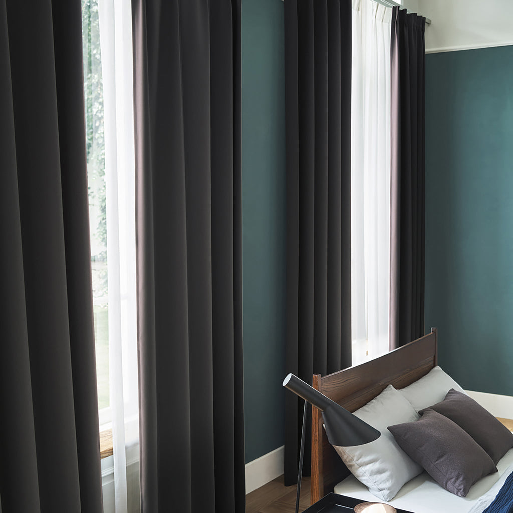 レザー調のエンボスを施した無地遮光。窓辺にクールなエッセンスを。