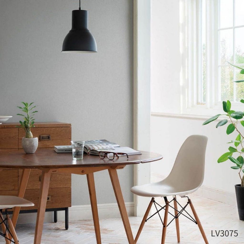 ややクールな印象のホワイトクロス(LV3074)は、メインの壁紙としてお使いいただけます。 クールな色味を生かして、スチール素材のチェアと合わせてすっきりとしたナチュラルインテリアに仕上げています。 グレー(LV3075)は、さりげないアクセントクロスにおすすめです。グレーは幅広いテイストに合わせやすいですが、クールな印象にもなりやすいので、木目家具であたたかみをプラスするとバランスよく仕上がります。