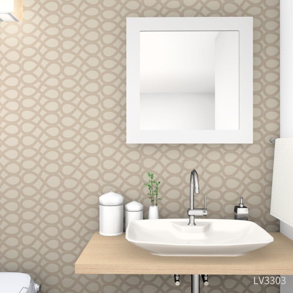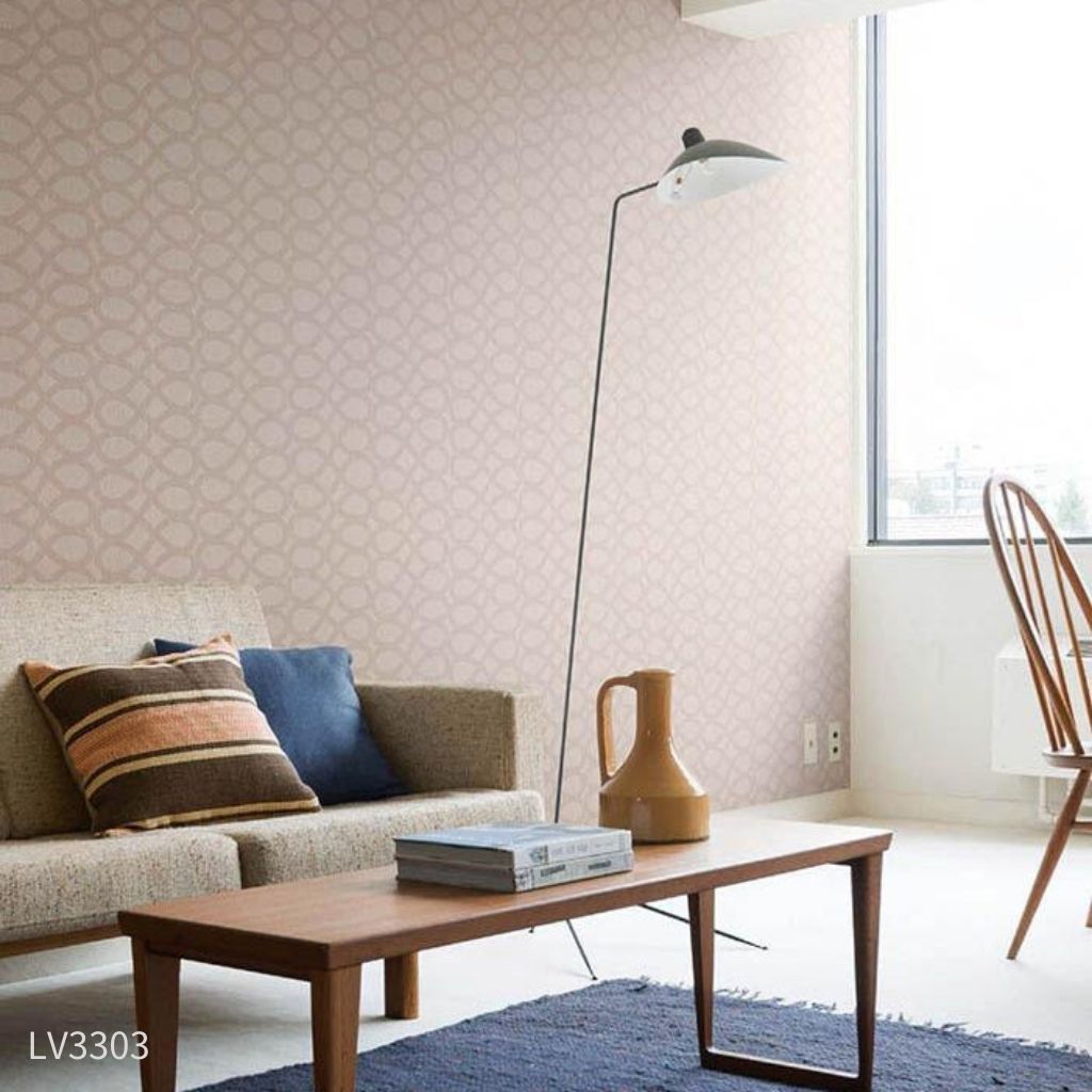 幾何学模様を麻のような風合いの織物調壁紙にあしらいました。インパクトのある模様ながら、素材感が自然なものなのでカジュアルなインテリアに合わせやすくなっています。自然素材のファブリックとのコーディネートもおすすめです。