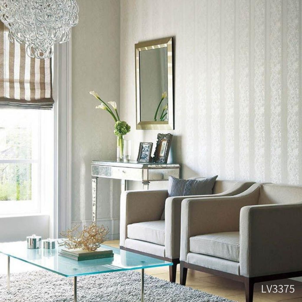 エレガントな柄の代名詞ともなるアラベスク柄とストライプをあしらった、エレガントさとすっきりさを感じる壁紙。アラベスクの柄はそれぞれ白に近いシルバーで、細い線で細部まで丁寧に描かれており、繊細なデザインになっています。