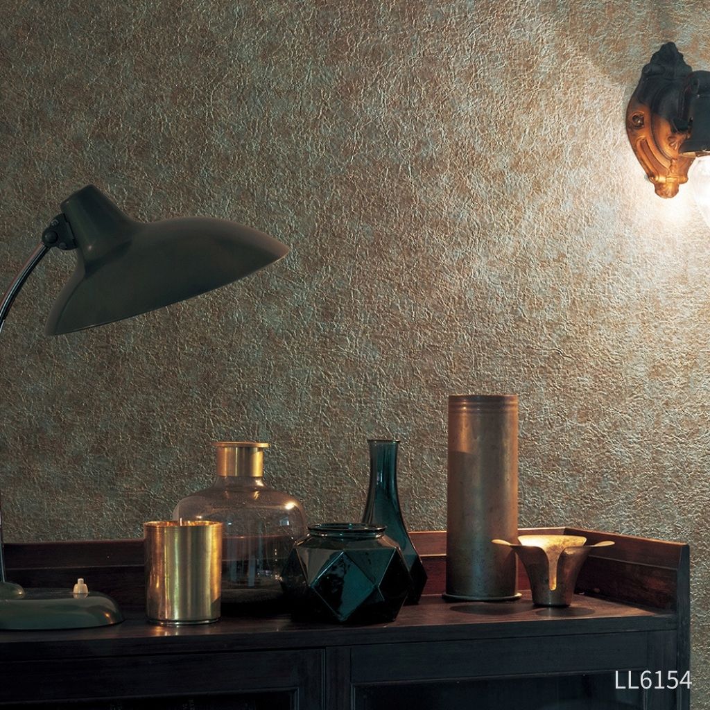 偏光パールを効かせた複雑なカラーが特徴的な壁紙。ひび割れのテクスチャーと組み合わせて、ハードで個性的な印象に。