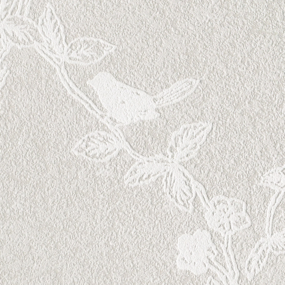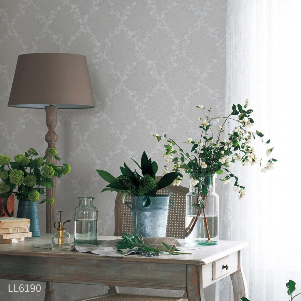枝と小鳥のシルエットをあしらった格子柄の壁紙。ドライな質感のグレーが、シャビーシックなインテリアやドライフラワーとのコーディネートにぴったりです。